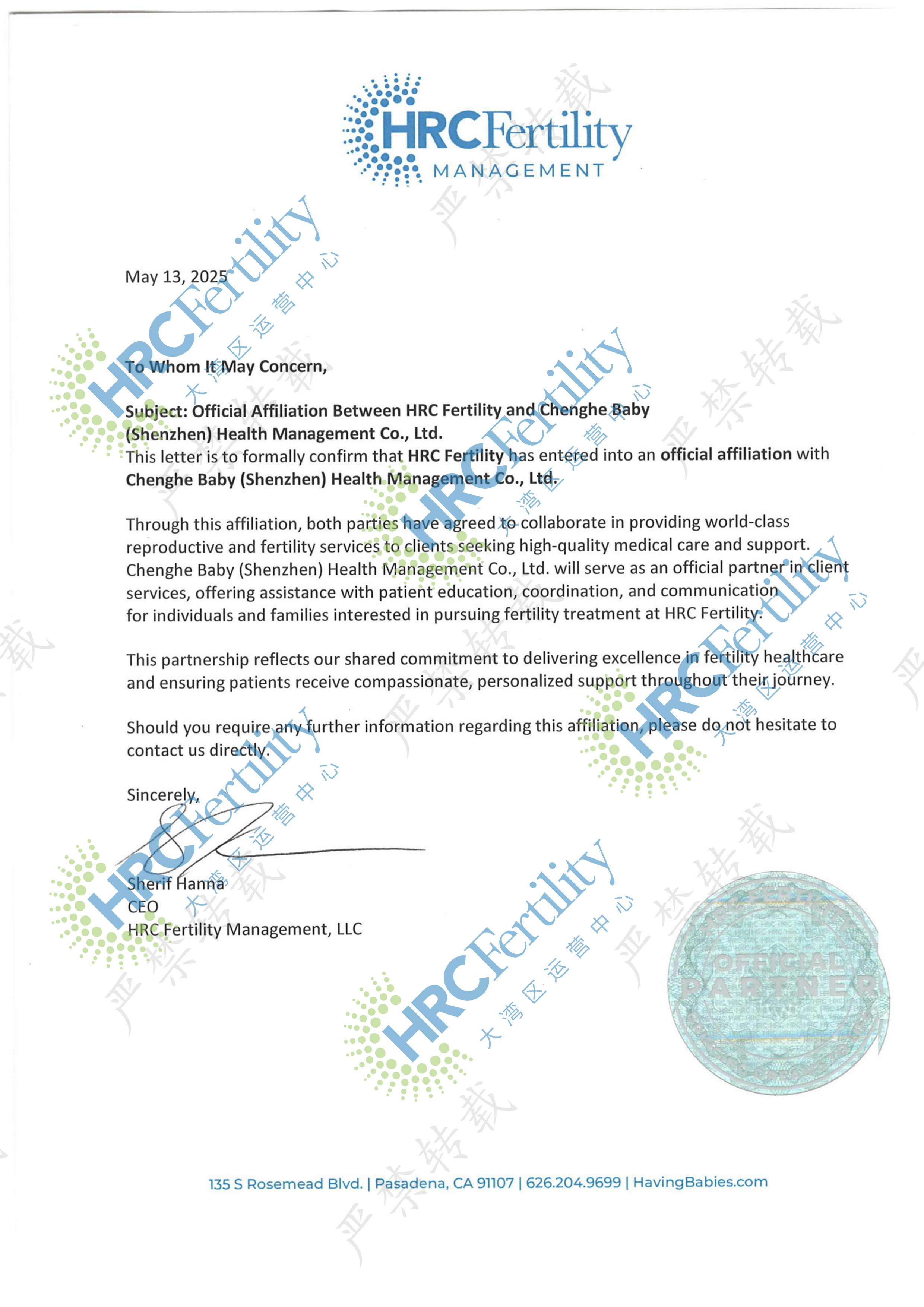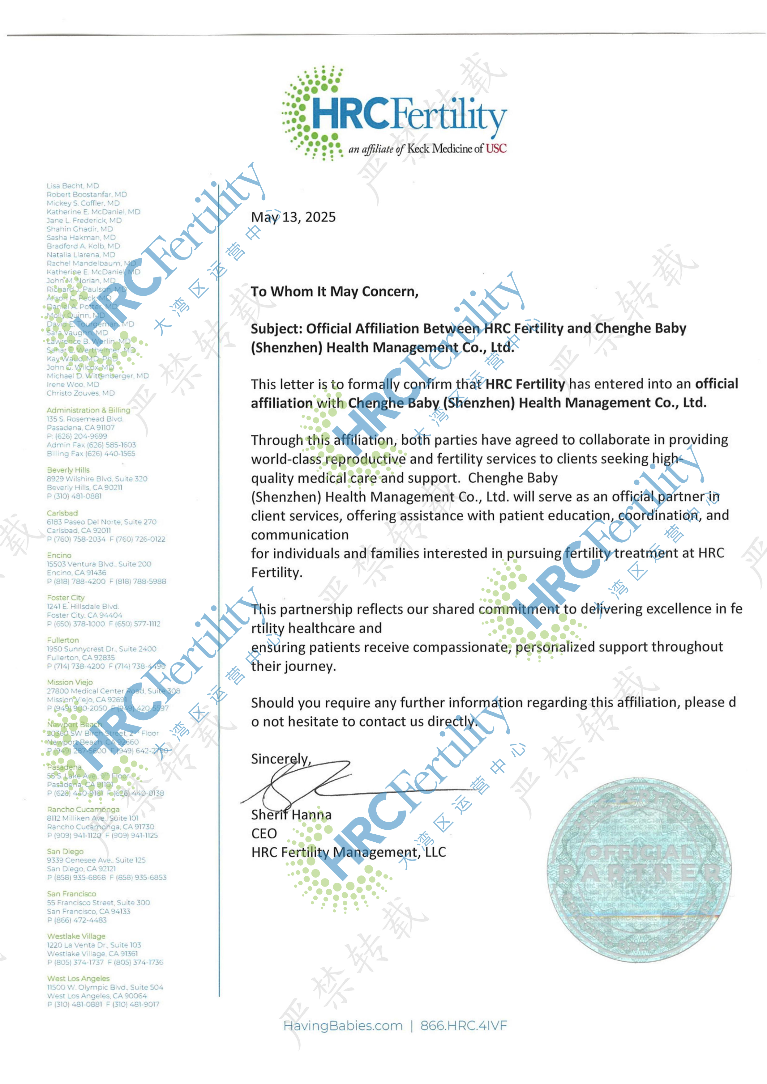 成和新生创始团队与美国HRC集团保持有十多年的友好合作关系,为适应双方当下的发展需求,进一步加深合作关系,2025年美国HRC Fertility生育医疗集团正式做出授权成和新生(深圳)健康管理有限公司做为其在中国大湾区的官方运营中心的决策。