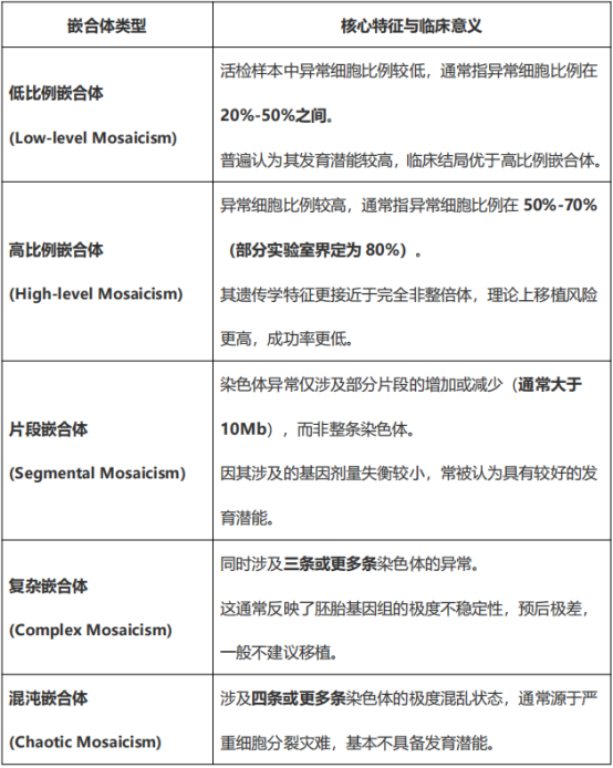 片段嵌合体(仅部分染色体片段异常):基因失衡小,若无整倍体胚胎可作为优先选择的嵌合体类型。