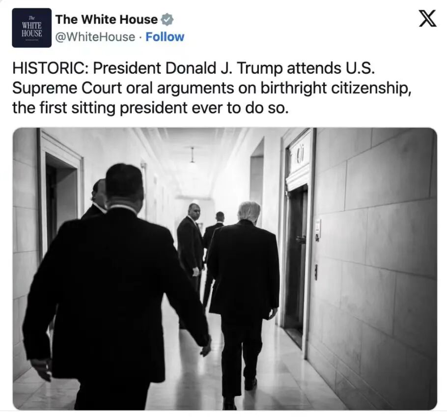 特朗普当天在大法官们结束对John Sauer的质询后便提前离开了最高法院,随后在社交媒体上发文。